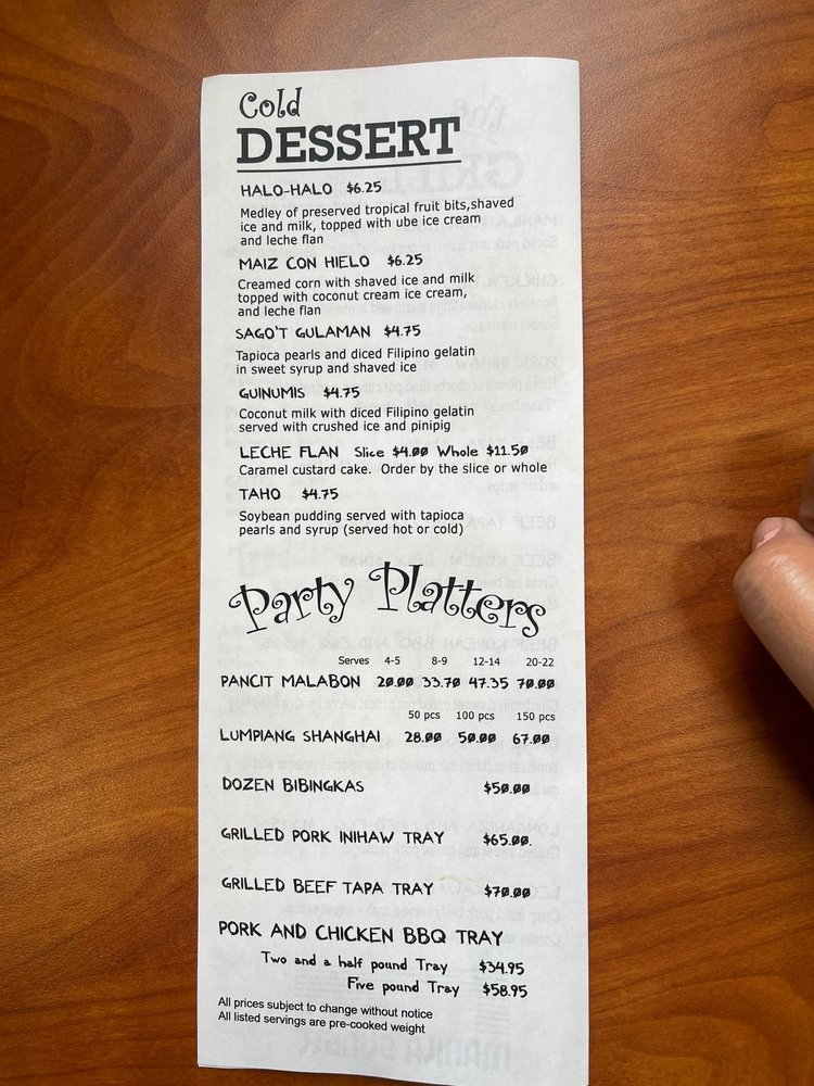 Don't miss their Pork Inihaw and the Beef Tapa, perfect for meat lovers craving charbroiled perfection. Sweet endings await you with traditional desserts like Halo-Halo and Maiz con Hielo, showcasing tropical flavors and creamy textures. Ideal for gatherings, their party platters make sharing a breeze.