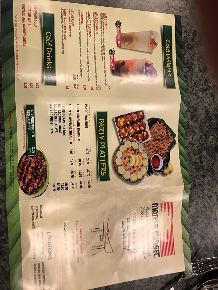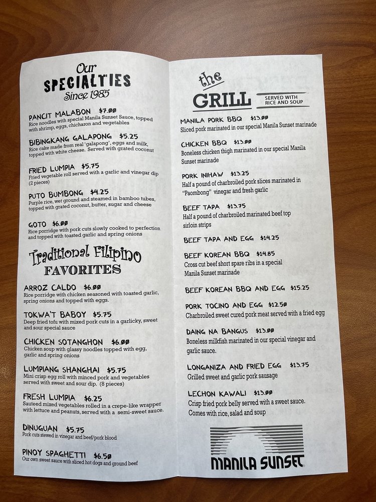 Introducing the menu at Manila Sunset Tukwila, a delightful haven for authentic Filipino cuisine located at 307 Tukwila Pkwy. This charming eatery offers a variety of grilled specialties that transport you straight to the heart of the Philippines. Highlights include the Manila Pork BBQ and Boneless Chicken BBQ, both marinated in their special Manila Sunset blend, ensuring tender, flavorful bites.